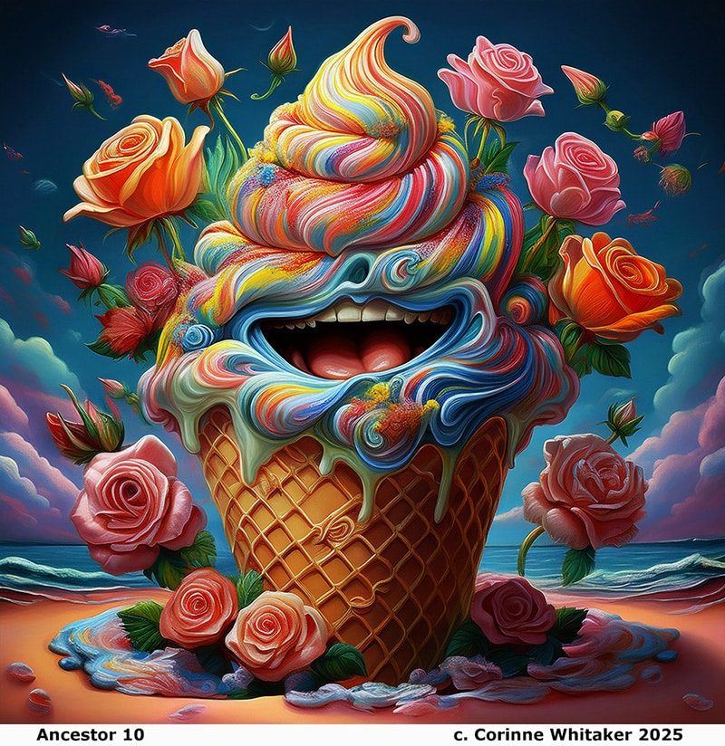 And then comes Ancestor 10, exploding with laughter in the form of a rainbow ice cream cone. Roses bloom from its sugary swirl, a giant mouth cackles with delight, and the whole scene bursts with absurd beauty. It’s a reminder that evolution is not just about survival — it’s also about joy, wit, and resilience. Humor, in the artist’s vision, is an ancestor too.