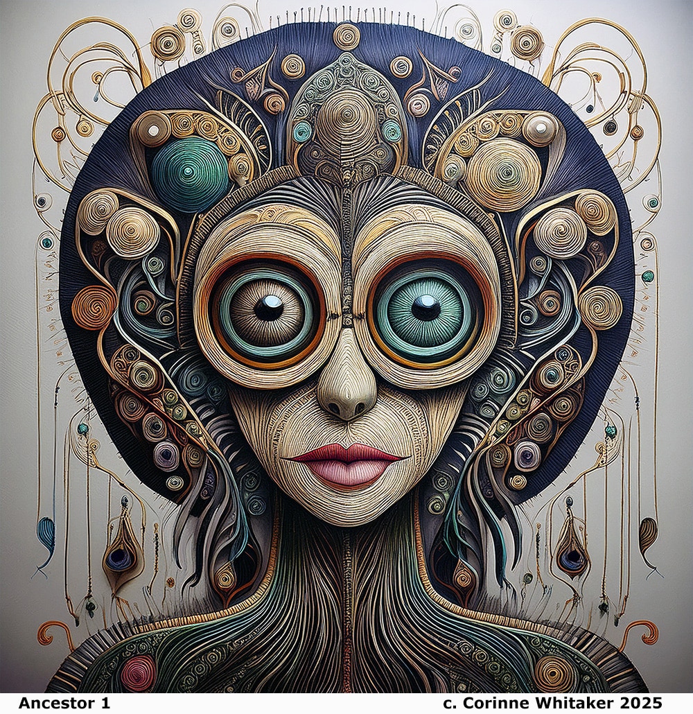 In Ancestor 1, we are met with a wide-eyed figure, spiraled and woven from intricate coils. Its gaze is piercing yet strangely tender, as though it sees further into us than we are willing to see ourselves. This is not a portrait in the traditional sense. It is an oracle — part cosmic, part comic — a witness holding our deepest codes of memory.