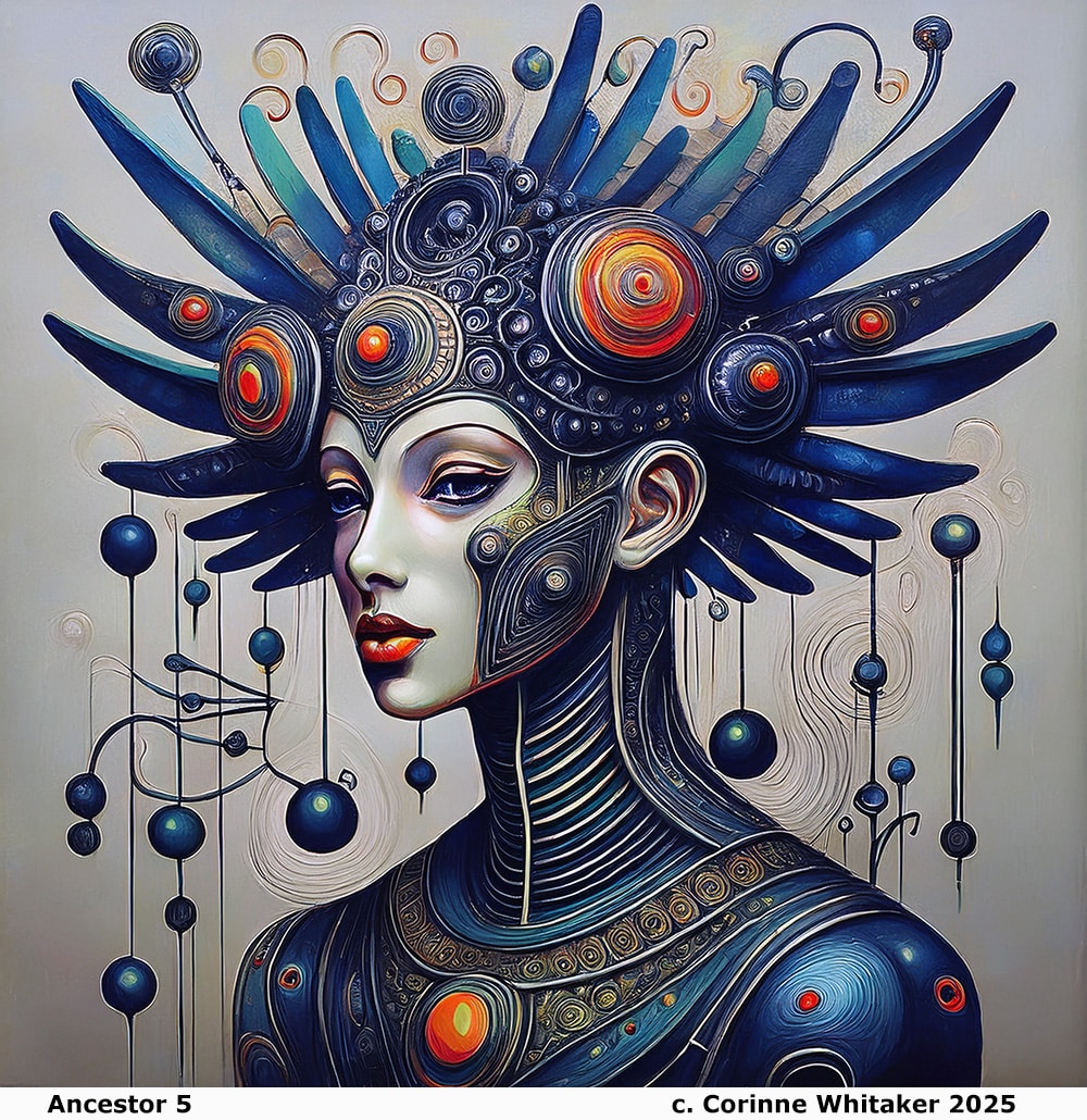 Ancestor 5 carries an entirely different energy: majestic, adorned, almost regal. Her headdress radiates outward like a constellation, spheres orbiting around her like satellites of thought and starlight. She feels like both priestess and cyborg, both past and future. Through her, Digital Giraffe collapses centuries and galaxies into a single presence.