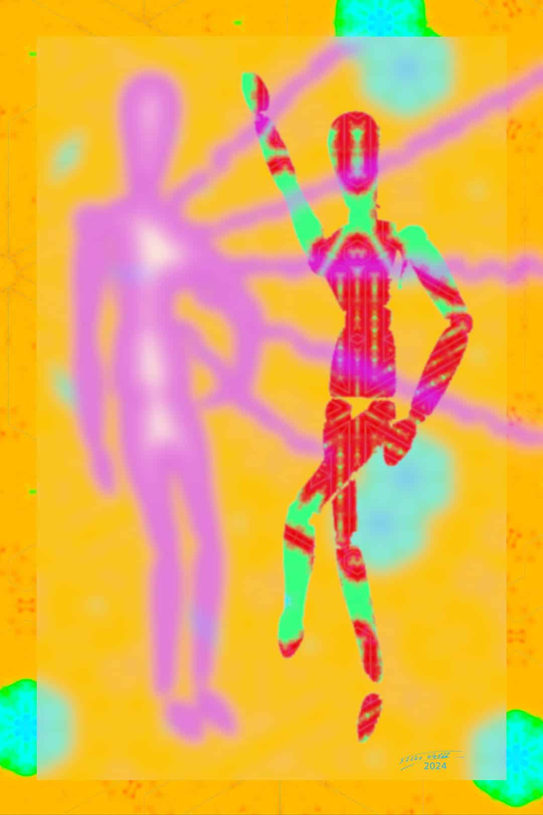 “Supra Bio Ghost” continues this exploration, delving deeper into the realm of the supernatural with a spectral figure that seems to transcend the digital canvas. The figure’s pose, imbued with a sense of motion and grace, is juxtaposed against a vibrant backdrop that pulsates with energy. Wolff’s use of neon colors and abstract patterns creates a hypnotic effect, inviting the viewer to ponder the mysteries of existence and the ethereal nature of the soul. This artwork, like its counterparts, is a testament to Wolff’s ability to convey complex, metaphysical themes through her silk Pop Art.