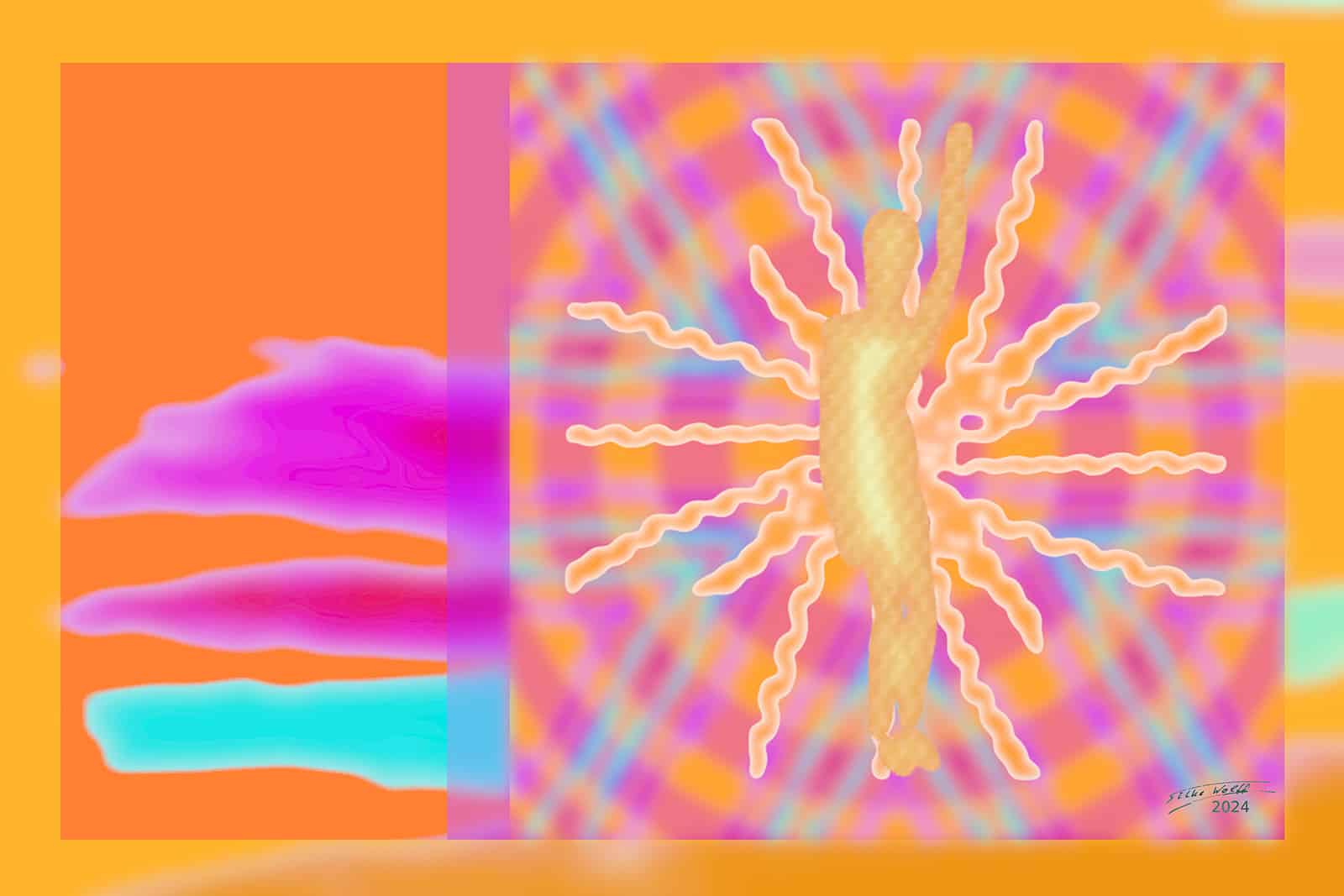 Silke Wolff’s latest works are a testament to her unique approach to vibrant expressionism, showcased through her distinctive silk Pop Art. The three pieces, “Para Juvenation,” “Supra Bio Ghost,” and “Supra Soul Appears,” are not mere images; they are profound reflections of Wolff’s supernatural experiences and her deep, metaphysical consciousness.